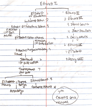 This line is identical to the relationship between Anne Boleyn and Henry VIII, except instead of Elizabeth Howard, Catherine Howard was descended from Edmund Howard. She and Henry were seventh cousins once removed. Catherine Howard was the least educated of all of Henry’s wives, and has the worst reputation. She was way too young to be queen.