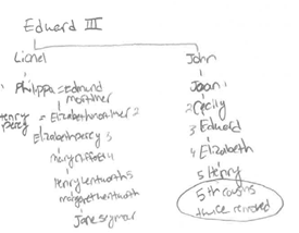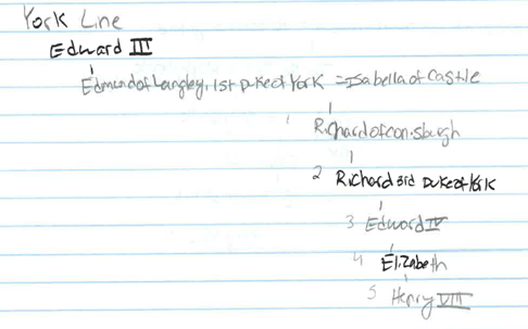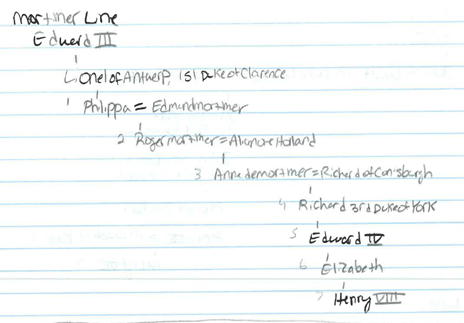 This line of descent is the one that gave Edward IV a direct, male link to the royal throne. It adds an extra step between Edward III and Henry VIII, and would shift Henry down in his relationship to his wives.