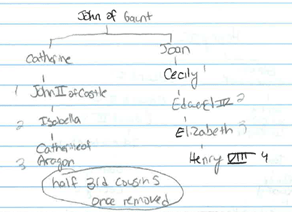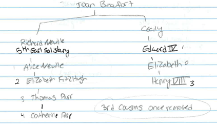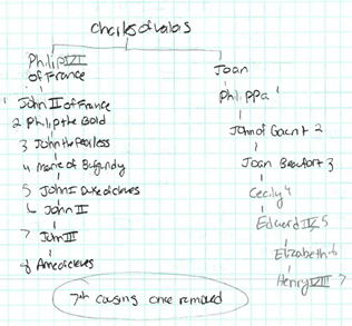 A disclaimer for all of these charts: As with all royal marriages of the times, several lines of descent were likely. The lines I have shown are either the best known, or the only ones I could find. It is likely, and probable, that more lines exist. For example, Henry was both third cousins and fourth cousins with Catherine of Aragon. See the final section for further explanation.