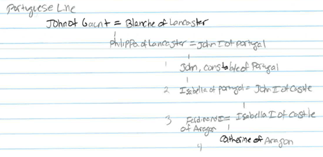 The line of descent I showed for Catherine of Aragon was the Castillian Line, through John of Gaunt’s second wife, Constance of Castile. Catherine was also descended from John’s first wife, Blanche of Lancaster and their daughter Philippa, who married the king of Portugal. This line of descent adds a step, shifting Catherine down in her relationship to her husband.