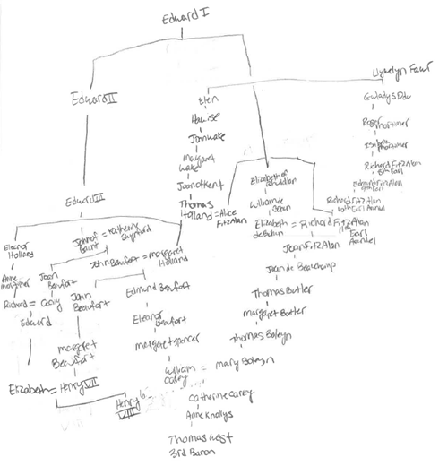 But what if Catherine Carey was actually the daughter of William Carey? Good news! William Carey was the grandson of Eleanor Beaufort, the granddaughter of John Beaufort, 1st Earl of Somerset and Margaret Holland. Which means that regardless of whether Catherine was the daughter of Henry or William, she was still descended from John Beaufort and Margaret Holland. My friend is still descended from Llywelyn, Joan, John of Gaunt, and Katherine Swynford.