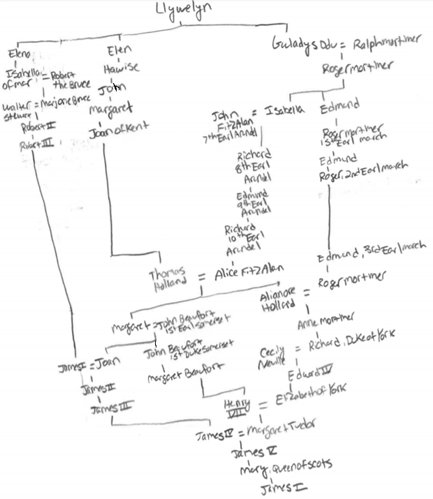 Eventually, Edward I became king. And faced off against Llywelyn G. And crushed him. Llywelyn G, sadly, left no descendants. But his granddad sure did. And now I get to my point.