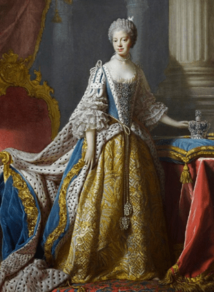 ANYWAY, Queen Charlotte tells the story of Queen Charlotte, wife to George III, or at least the early days of their marriage. It’s a surprisingly dramatic story, even without the embellishment of a made-for-tv period romance. But, like I am wont to do, I’m here to break down fact from fiction, and, if you remember my article on Outlander, to fawn over my favorite fashion period. For reference, Outlander (at least the first few books/seasons) takes place about twenty years before Queen Charlotte, so they’re both Rococo.